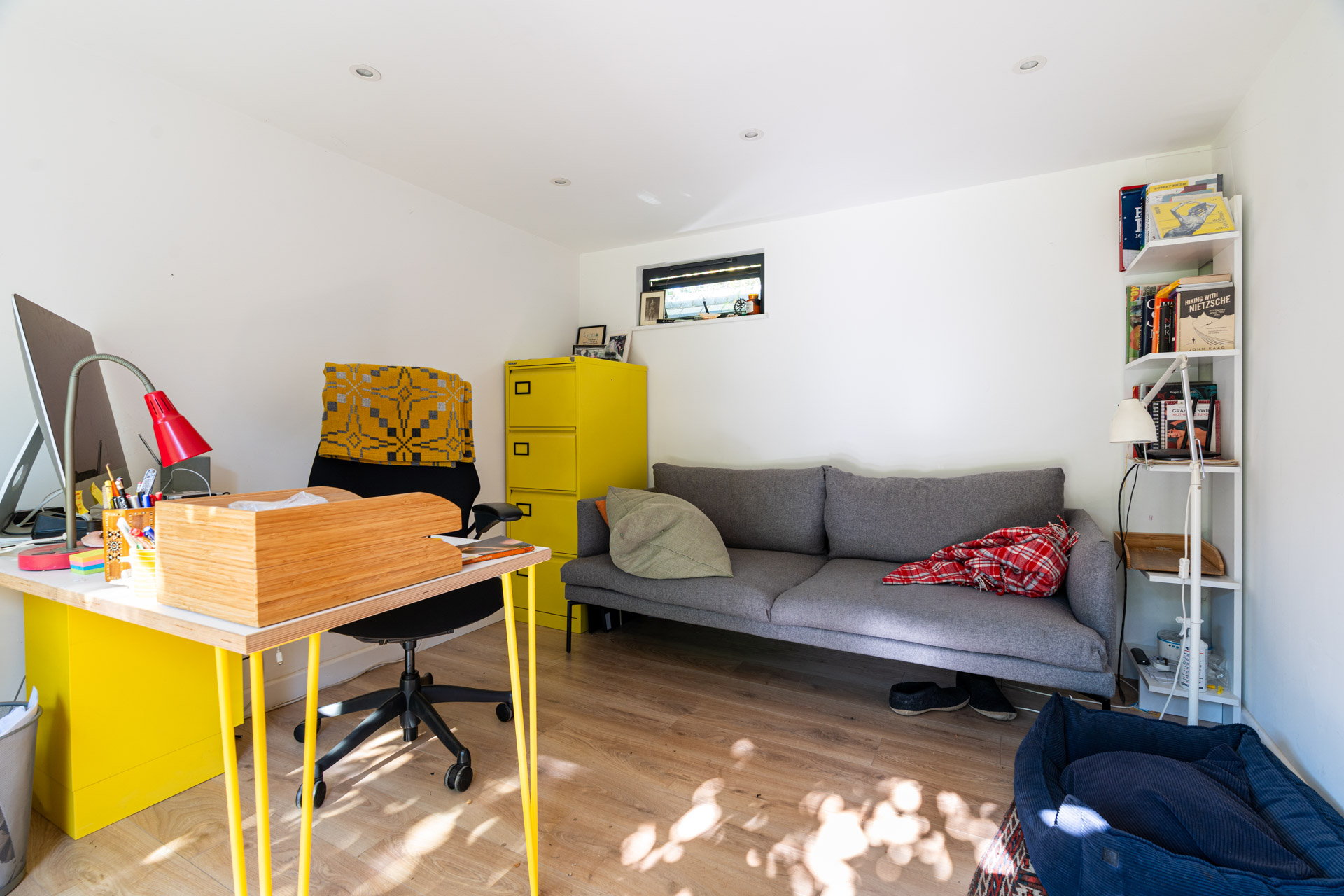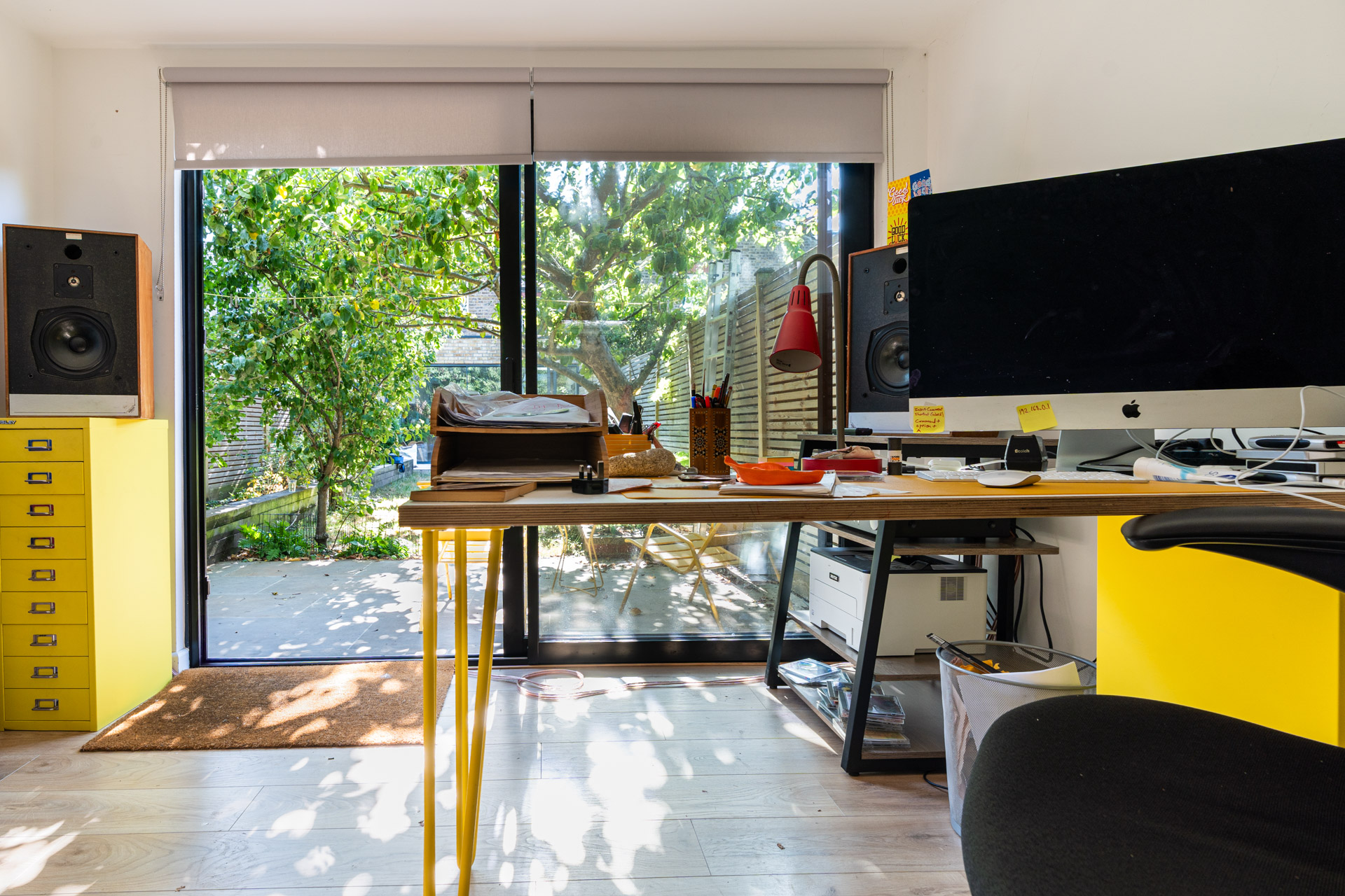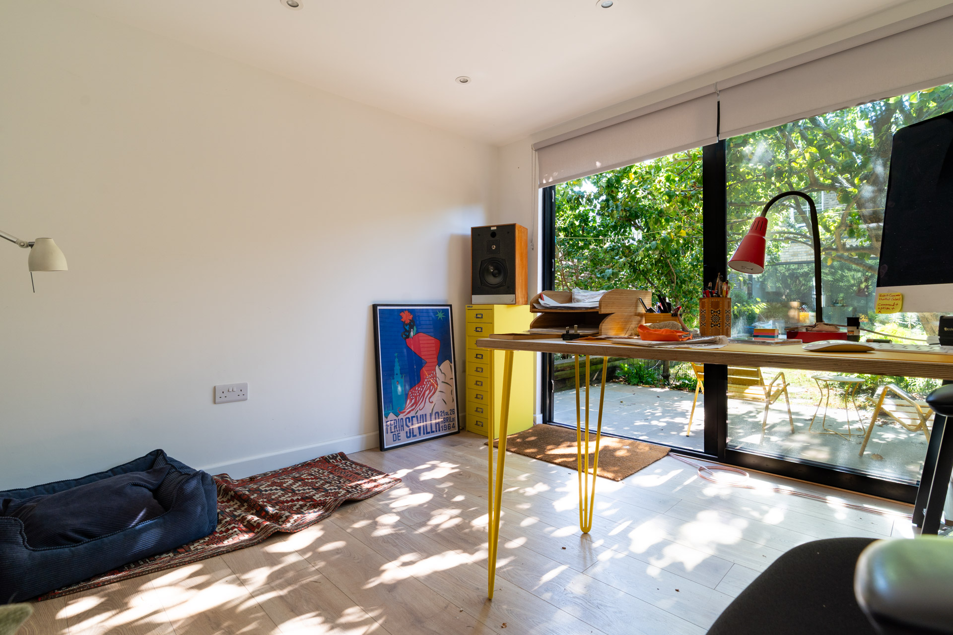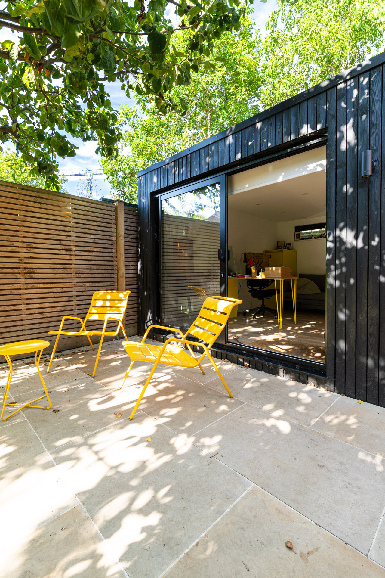 A garden office with a clear desk. No toys, no clutter. Just room to think.