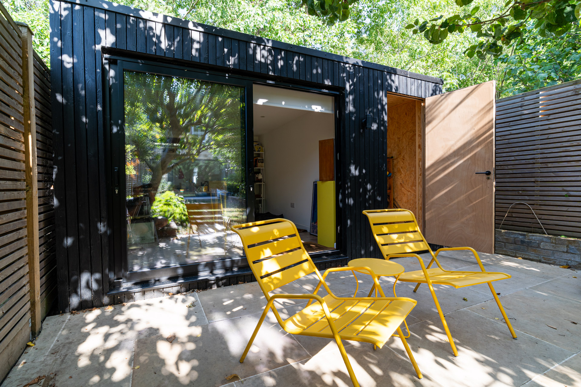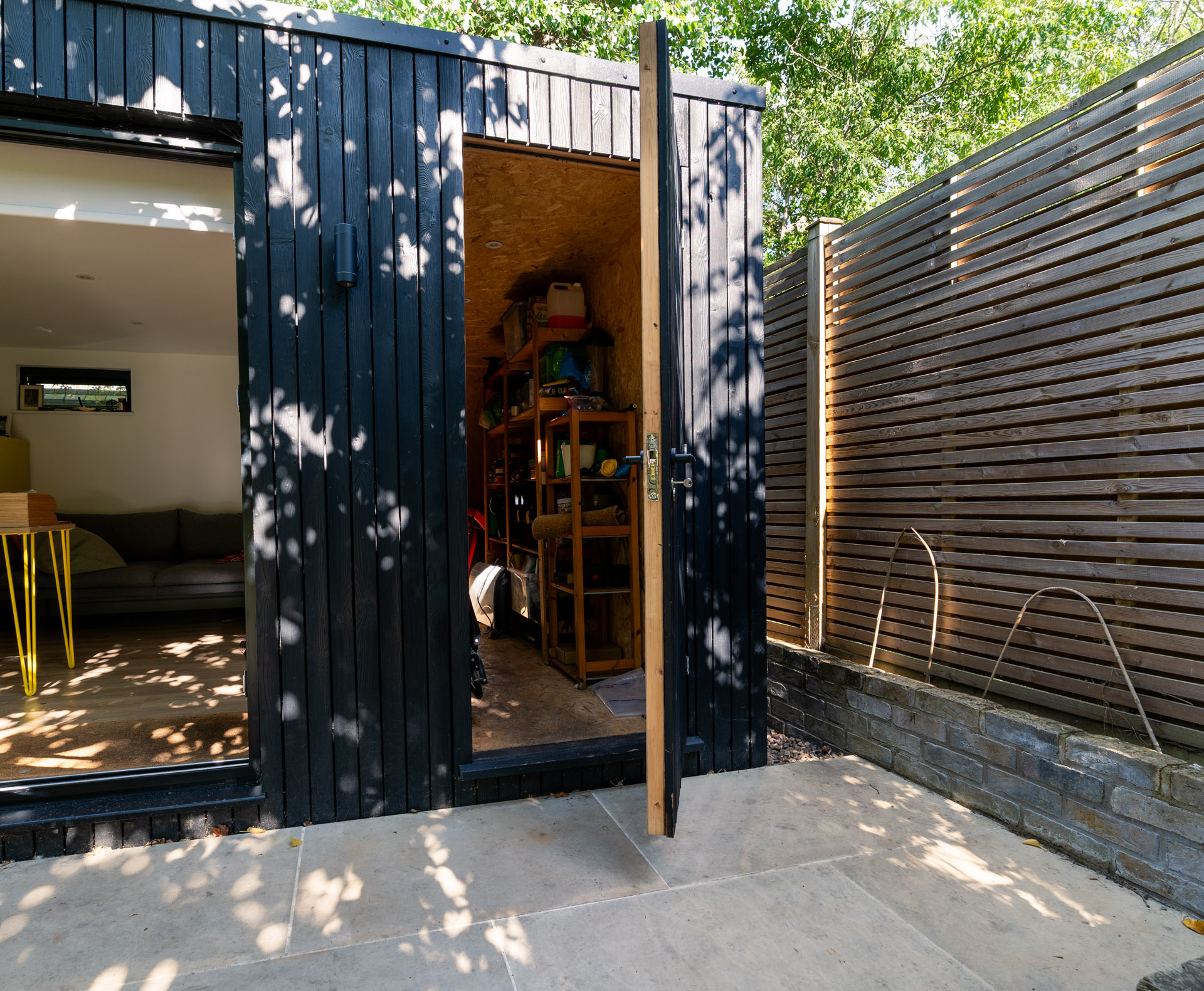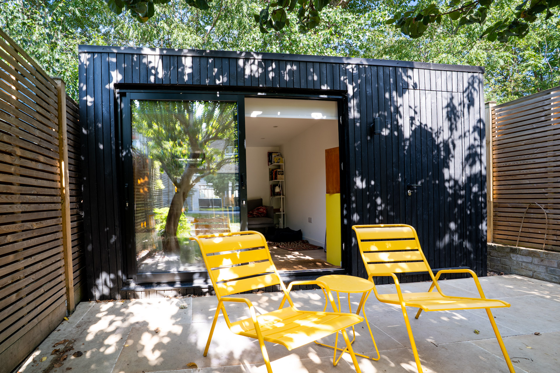 They have carefully curated interior and exterior colourful items to contrast the rich tone of the burnt larch cladding.
