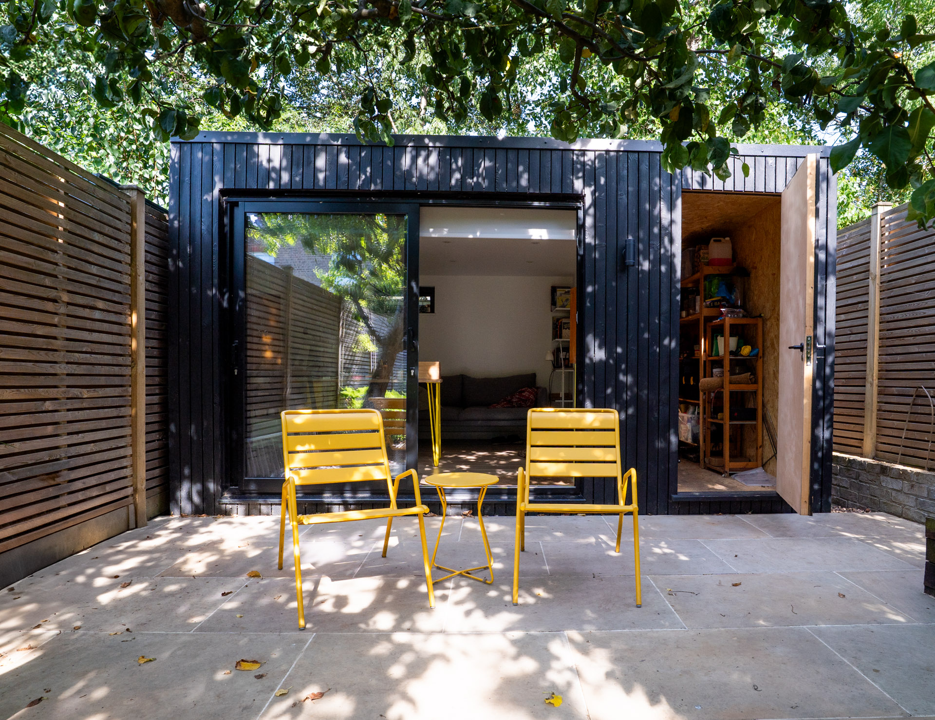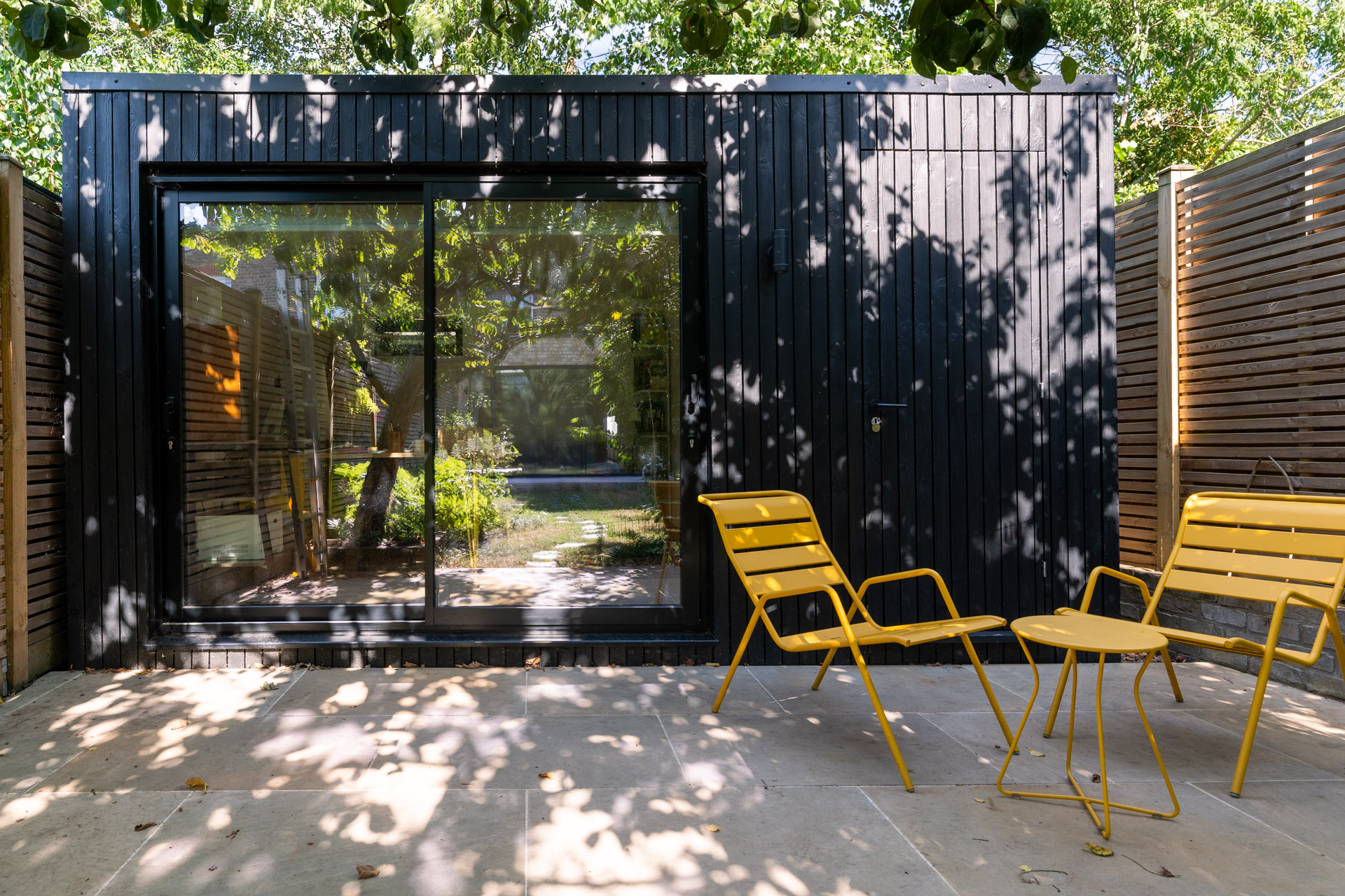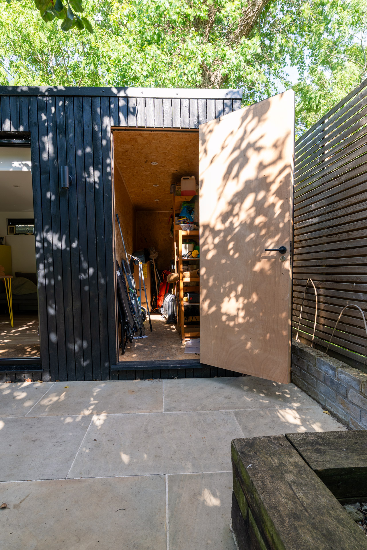 They have carefully curated interior and exterior colourful items to contrast the rich tone of the burnt larch cladding.