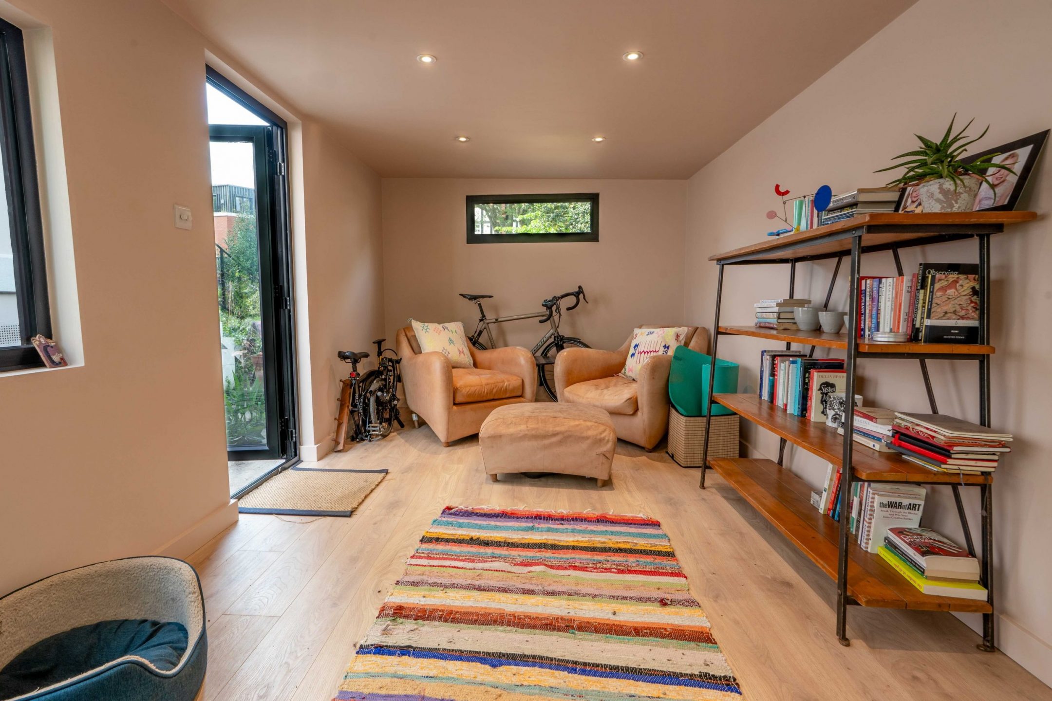 Our favourite feature of this garden room is the interior window that frames the client’s garden and greenhouse. It’s a subtle detail that ensures the space is filled with natural light, giving a quiet, green outlook for work.
